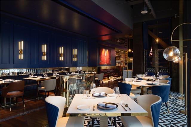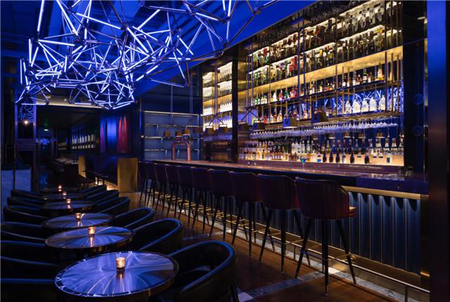 室内设计师将300m²的酒吧区划为餐区、夜店、廊吧、餐厅厨房几大地区,以深蓝色主导主旋律将好多个地区连接成一体化。极大的落地式夹层玻璃将江面的景色导入房间内,保存出老造船厂的百年老立杆,配搭紫铜、天然大理石、镜面玻璃等修容材料,体现了时下与往日的经典故事。