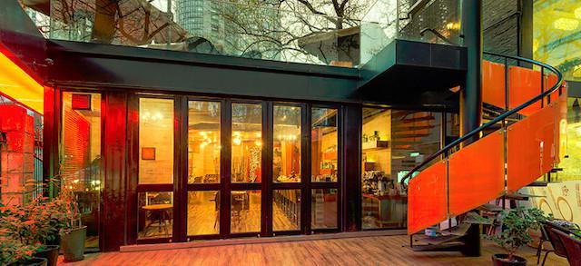 1、独立的立于林荫之中,一边是车水马龙,一边是娴静清幽。店内装修以木材为中心,沿街的座位旁边有一扇大地板窗,环境温暖舒适。